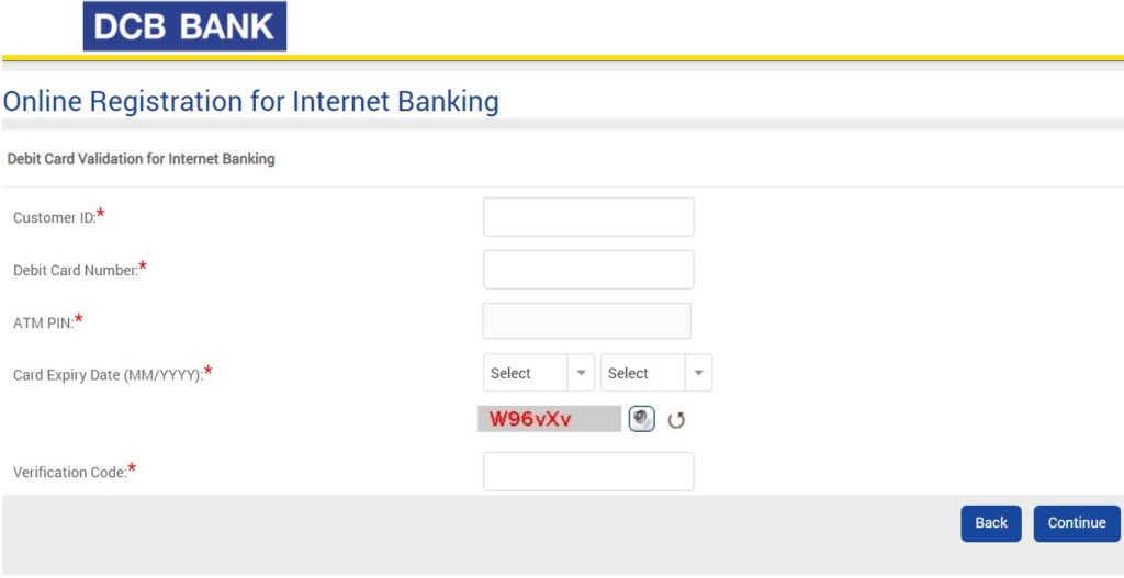 - Enter DCB customer id, Debit card information and OTP sent to registered mobile number.